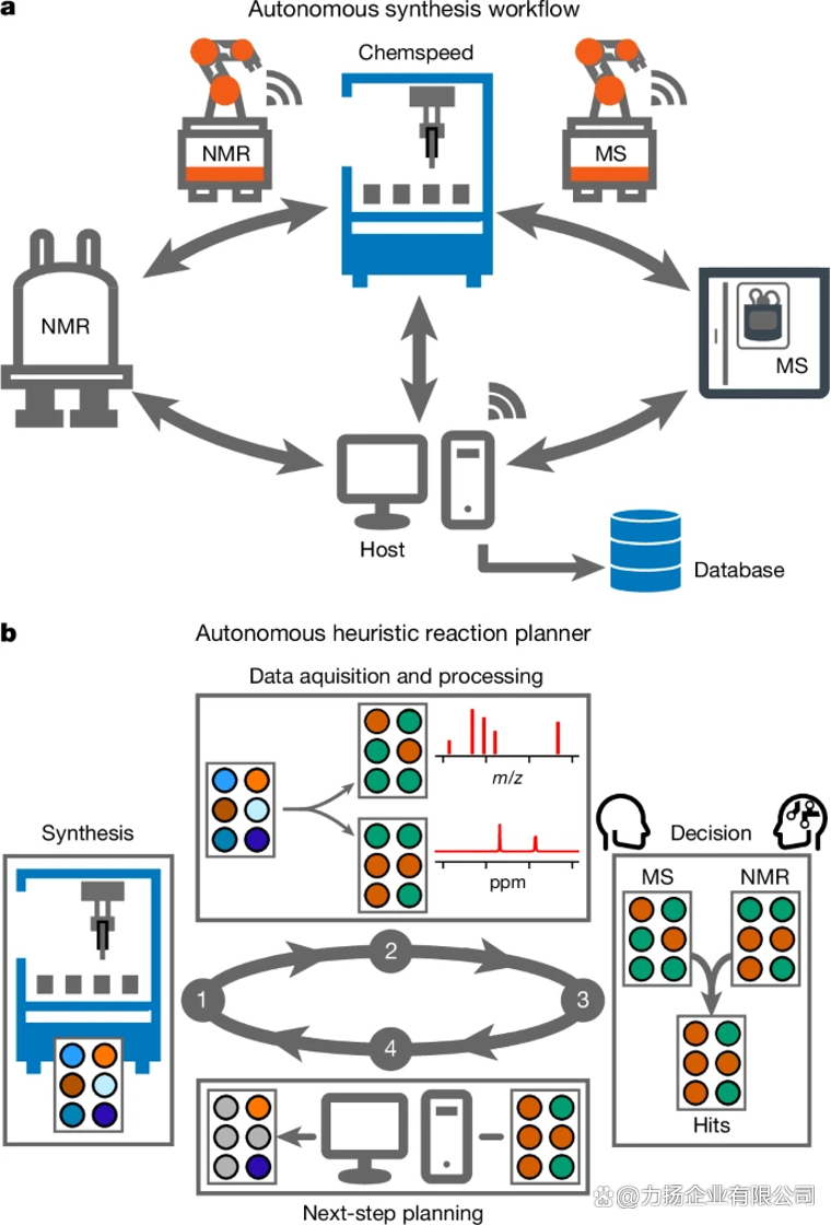 利物浦大学团队的 “AI 化学家” 是一个通过移动机器人集成的 “合成+分析” 的平台。移动机器人在不同的功能模块之间自由移动,运送和处理样品。这种模式可以无限制地整合放置在实验室不同地方的多种仪器。“AI 化学家” 以移动机器人整合了 Chemspeed ISYNTH 合成平台、超高效液相色谱-质谱联用仪(UPLC-MS)和台式核磁共振(NMR)光谱仪,可用于解决化学探索中三个主要问题:执行反应、分析产品以及根据数据决定下一步的行动。